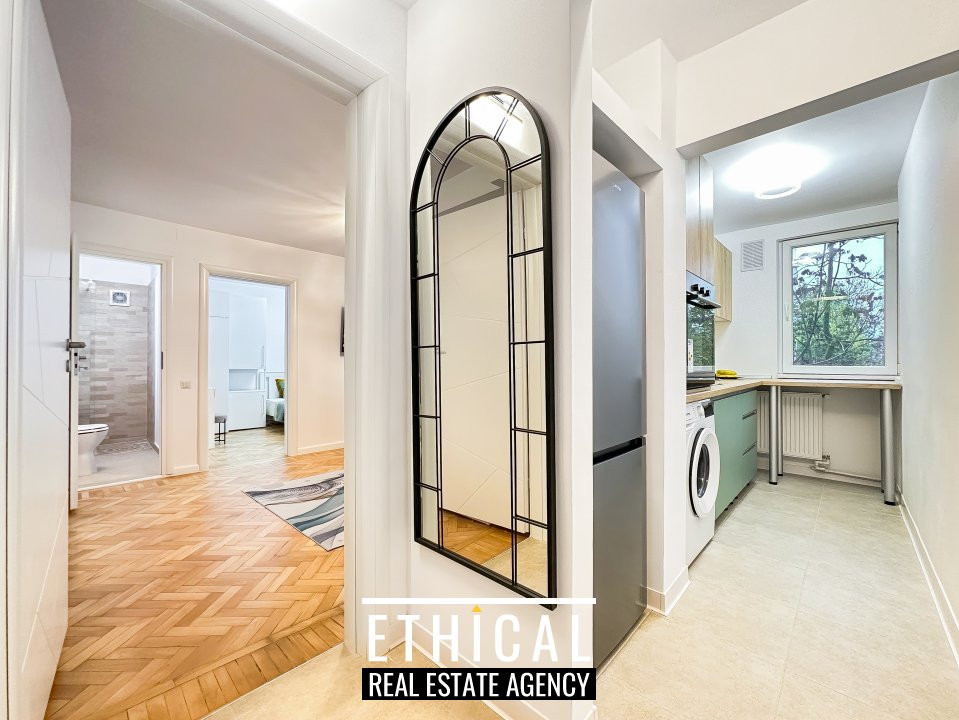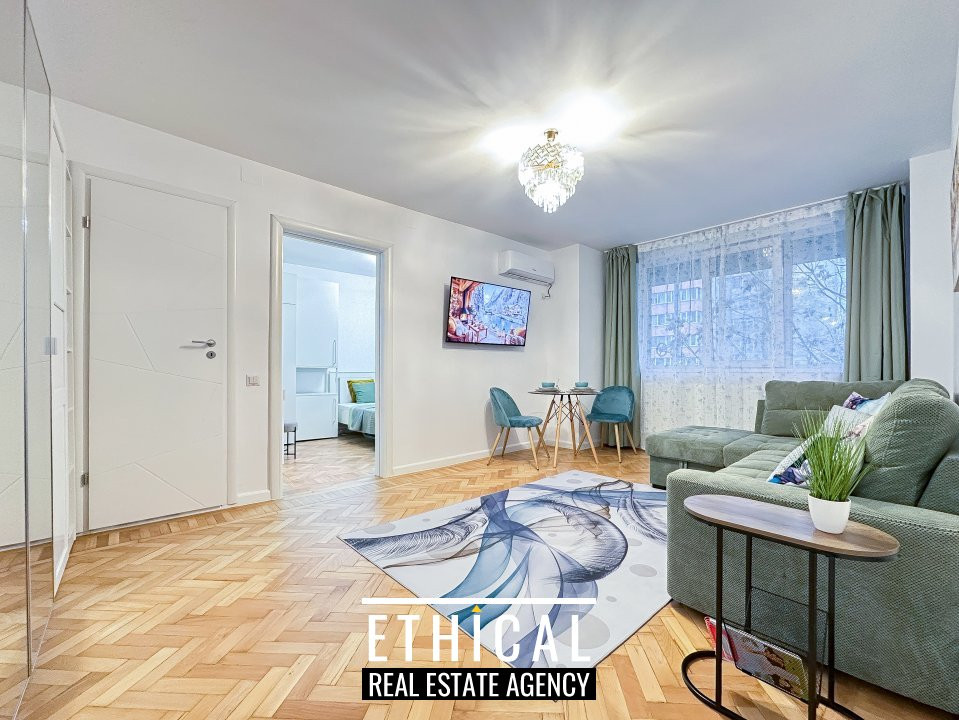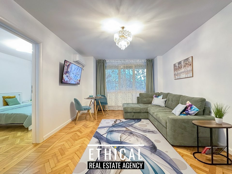 Apartament cu 2 camere mobilat si utilat coomplet. Este renovat integral (instalatii electrice noi, instalatii sanitare noi, mobila noua, tamplarie noua, electrocasnice noi etc.) fiind la prima inchiriere.