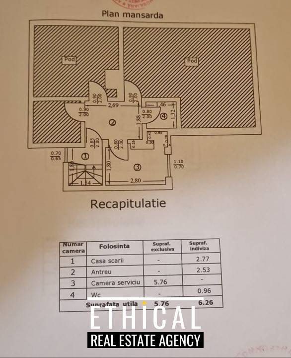 - Mansarda - Camera de 5,76 mp + Pod utilizabil ~10mp + spatii in folosinta comuna (Casa scarii, antreu, wc) 6.26mp.
